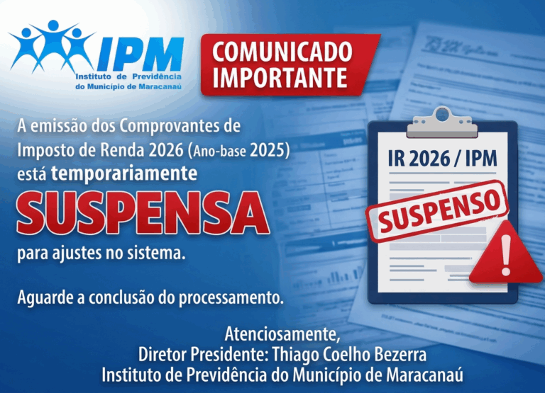 Últimas notícias Aposentados AVISO IMPORTANTE AOS SEGURADOS DO IPM Informamos que a disponibilização dos Informes de Rendimentos para a Declaração do Imposto de Renda 2026 (ano-base 2025) encontra-se temporariamente… 20 de março de 2026 Leia mais → Sem categoria DIVULGAÇÃO DO CALENDÁRIO ANUAL DE PAGAMENTOS DOS BENEFÍCIOS APOSENTADORIAS E PENSÕES POR MORTE, DO ANO DE 2026 DIVULGAÇÃO DO CALENDÁRIO ANUAL DE PAGAMENTOS DOS BENEFÍCIOS APOSENTADORIAS E PENSÕES POR MORTE, DO ANO DE 2026. 20 de janeiro de 2026 Leia mais → Conselho Municipal de Previdência REUNIÃO DO CONSELHO DE PREVIDÊNCIA Na manhã desta quarta-feira, 14 de janeiro, aconteceu a primeira sessão ordinária do Conselho Municipal de Previdência do IPM –… 15 de janeiro de 2026 Leia mais → Comitê de instimentos Hoje os membros do Comitê de Investimentos tiveram a primeira reunião ordinária de 2026, onde participaram de uma Live com a Assessoria LEMA Investimentos e outros RPPS Hoje os membros do Comitê de Investimentos tiveram a primeira reunião ordinária de 2026, onde participaram de uma Live com… 8 de janeiro de 2026 Leia mais → Comitê de instimentos Hoje os membros do Comitê de Investimentos se reuniram para mais uma reunião ordinária,com a Assessoria LEMA Investimentos, participando excepcionalmente de forma on-line Hoje os membros do Comitê de Investimentos se reuniram para mais uma reunião ordinária,com a Assessoria LEMA Investimentos, participando excepcionalmente… 4 de novembro de 2025 Leia mais → Informativo REUNIÃO COM ACSs E ACEs Na manhã desta sexta-feira, 08, na Arena Carlão, em Pajuçara, a convite da direção do SINDRACS, o diretor-presidente do Instituto… 9 de agosto de 2025 Leia mais →