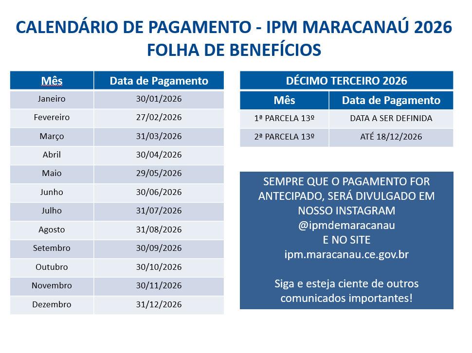 Sem categoria DIVULGAÇÃO DO CALENDÁRIO ANUAL DE PAGAMENTOS DOS BENEFÍCIOS APOSENTADORIAS E PENSÕES POR MORTE, DO ANO DE 2026 20 de janeiro de 2026 DIVULGAÇÃO DO CALENDÁRIO ANUAL DE PAGAMENTOS DOS BENEFÍCIOS APOSENTADORIAS E PENSÕES POR MORTE, DO ANO DE 2026. Compartilhe: Post Anterior